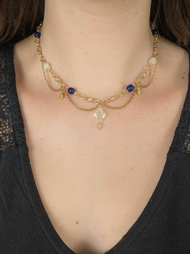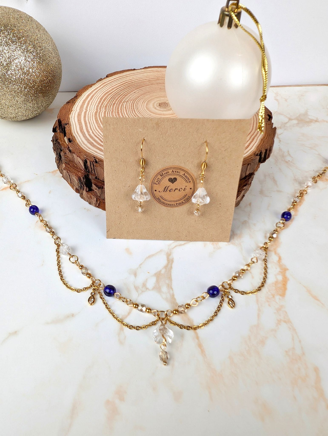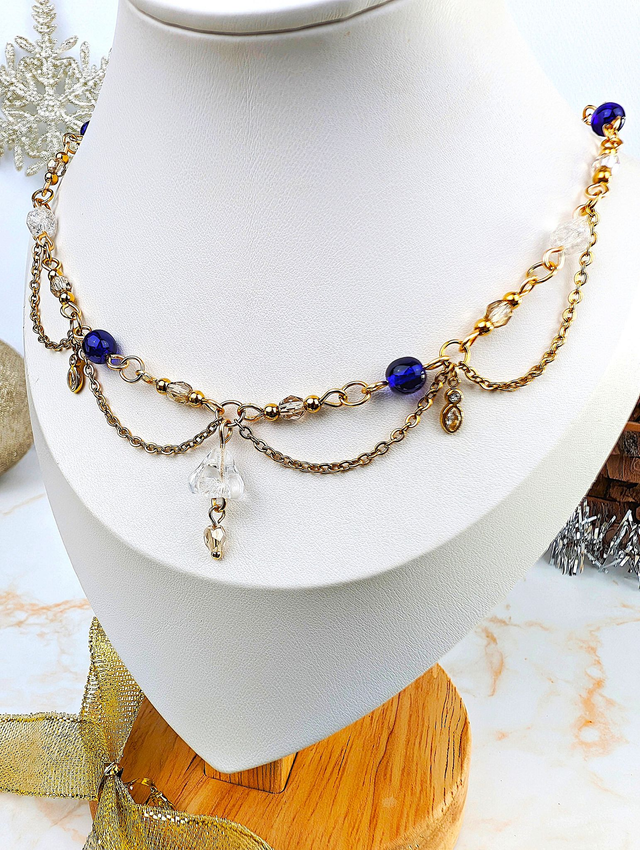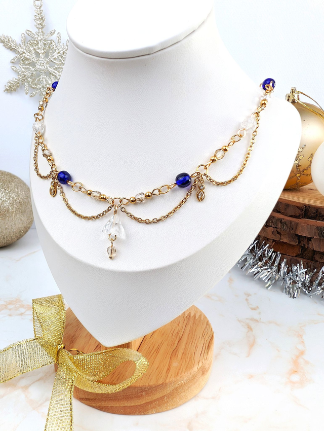 Ce collier aux teintes bleu nuit et aux perles de glace vous démarquera avec élégance ! Sa finesse et sa fleur centrale ajoutent une touche de féminité à ses Reflets Glacés.